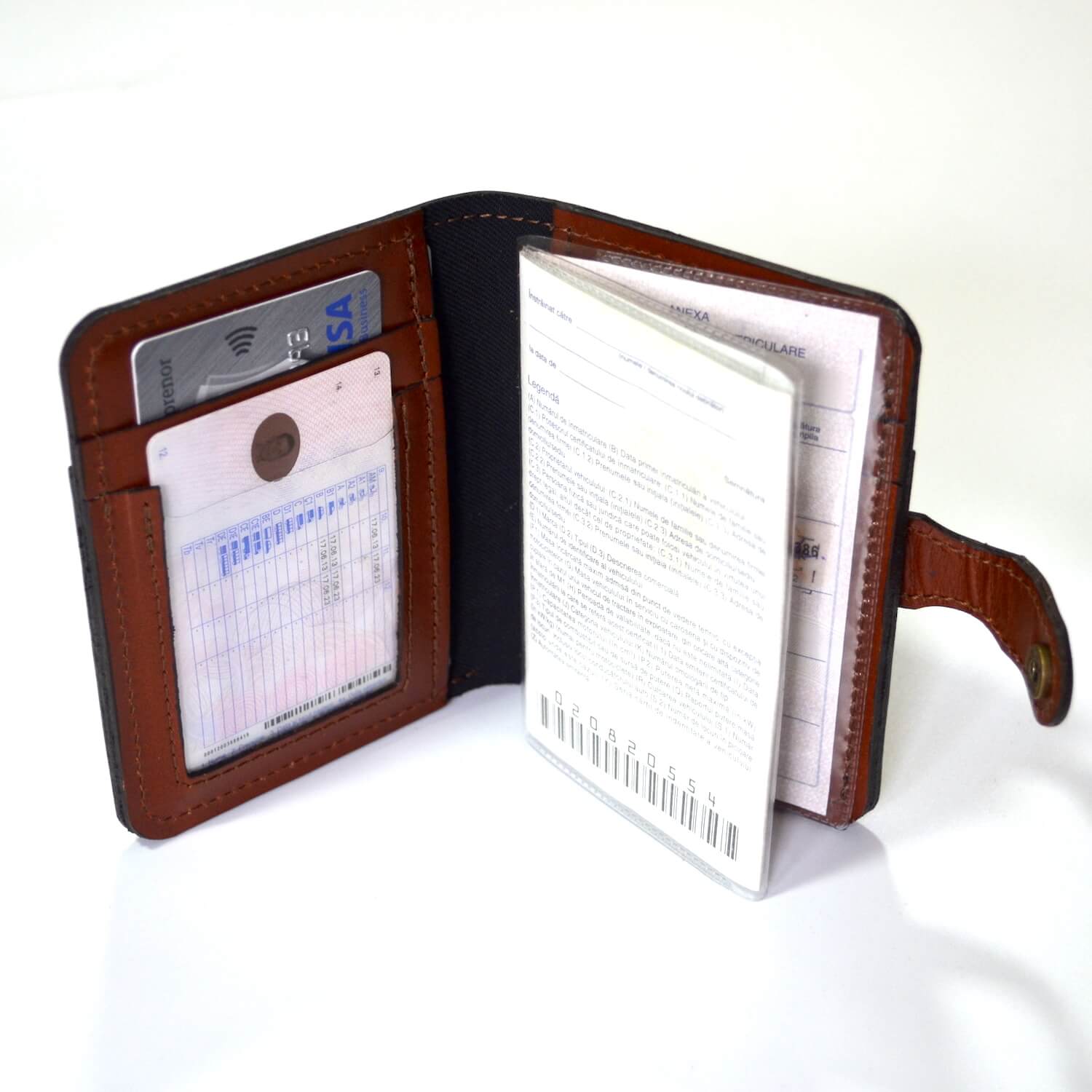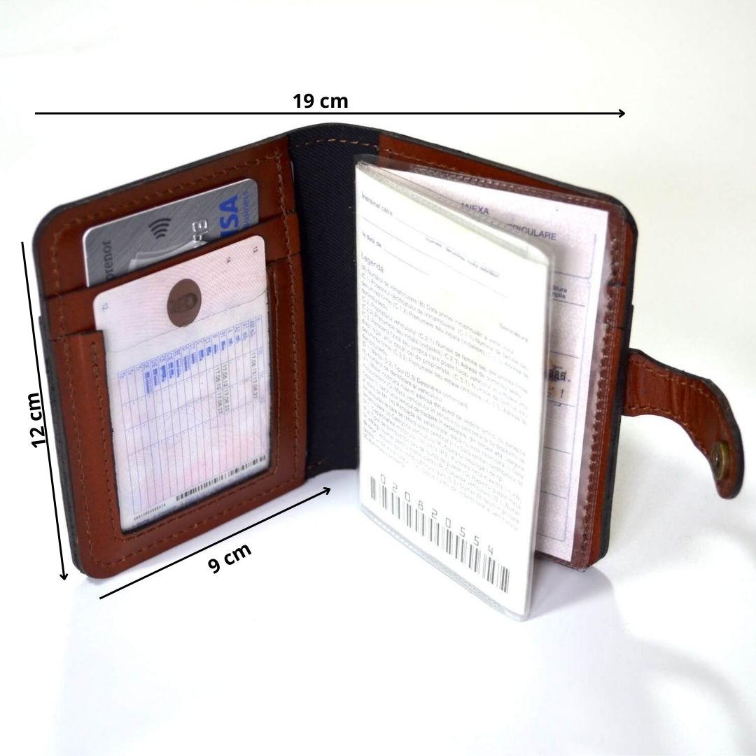 Portofel acte auto personalizat cu nume, realizat din piele naturala, maro coniac, rosu sau negru.