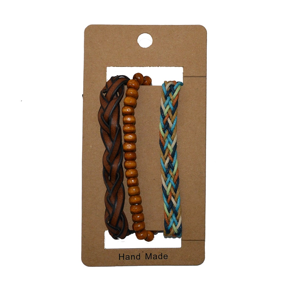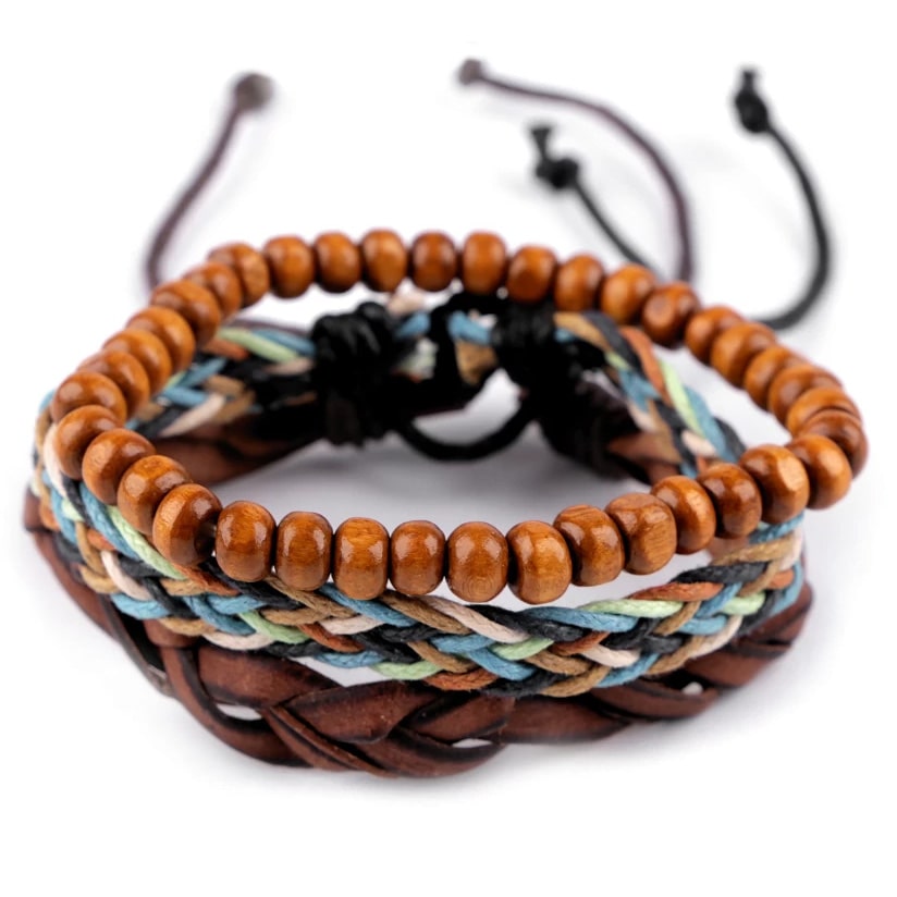 Cele 3 bratari realizate handemade sunt o achizitie unica, acestea sunt conceputete sa se poarte atat impreuna cat si separat, potrivite atat pentru barbati cat si pentru femei. Ele fiind realizate  dintr-o piele naturala maro, bumbac si margele din lemn sistemul de inchidre  este unul simplist, cele cu margele din lemn este elastic, celelelate au un nod cantral prin care poti strange sau desface bratara.